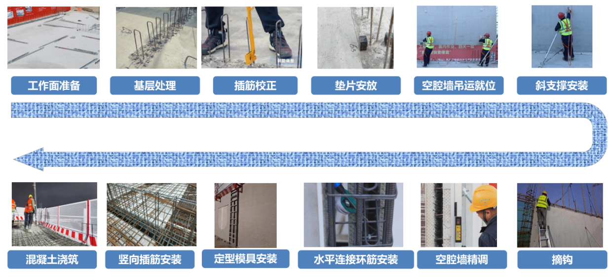SPCS技术路线通过标准化、流程化的设计和施工,具有“空腔搭接加后浇、等效异构好快省”的优势,能够实现“墙柱梁板全预制、地上地下全装配”。通过提前预埋连接钢筋,确保上下层墙体的有效连接,吊装施工简单,工人上手快,能够快速推进施工进度,大大提高施工效率。