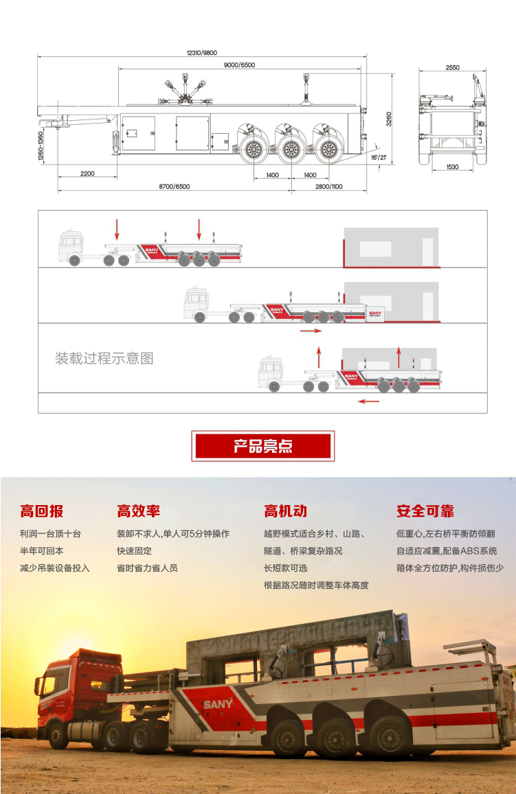 自适应减震:采用电液油气悬架系统,满足车辆在任意载荷下的减震需求,大幅度降低运输颠簸。