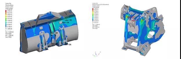 通过大数据分析设备常见故障点,完成了铲斗、前车架、车身等零部件多轮CAE仿真及优化,并完成实验验证,整车已在内部完成等近三十种企标实验要求。