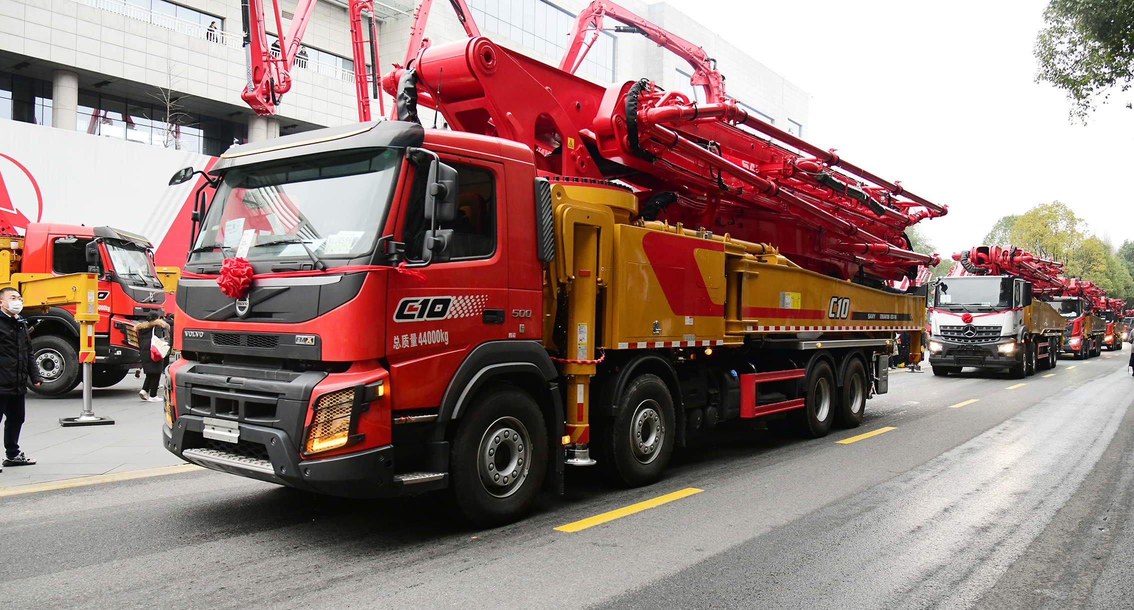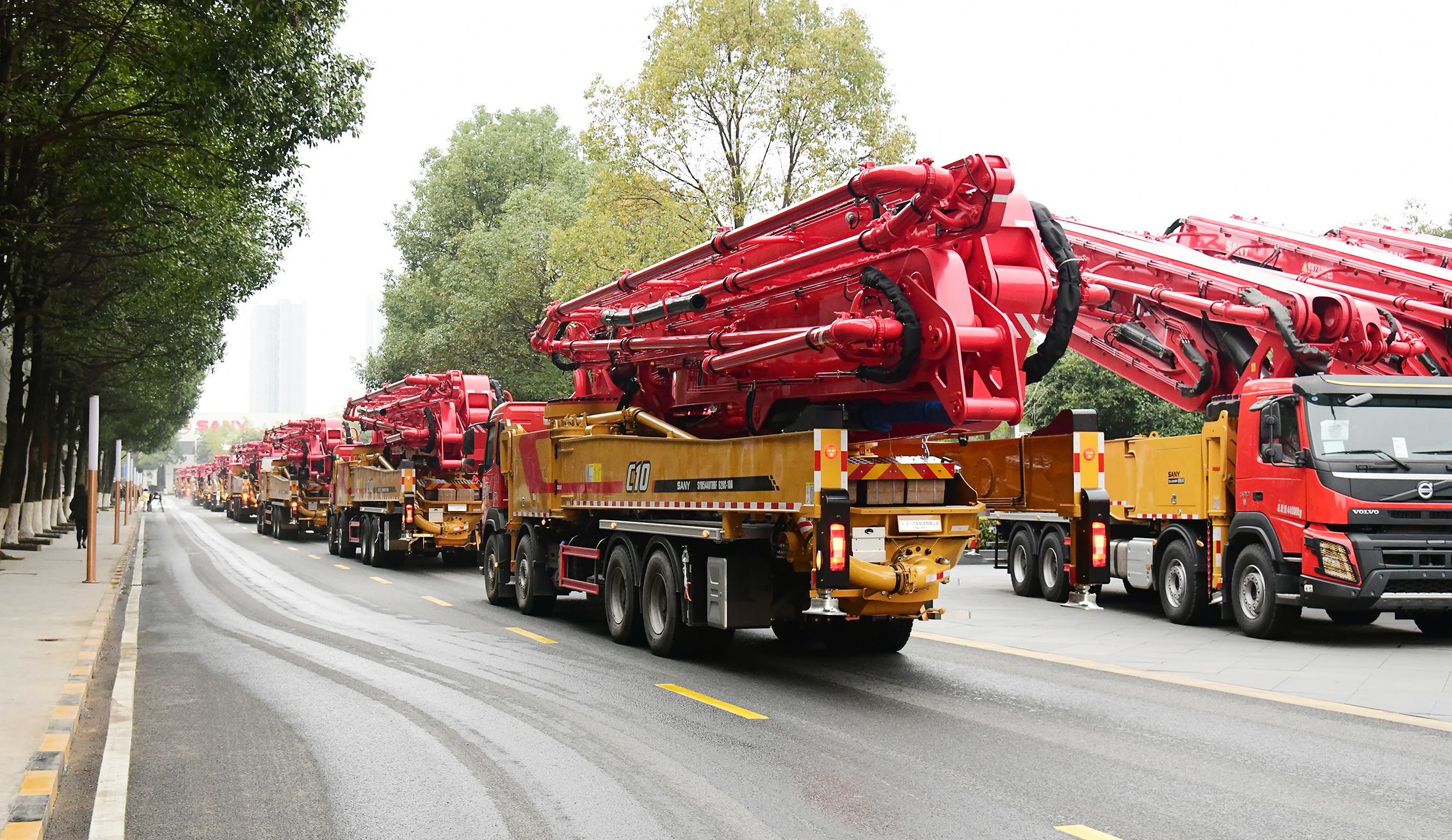 长沙厂区主干道上,66台“世界泵王”整装待发,接受现场各位领导和来宾的检阅。本次发货的产品涵盖37米、43米、56米等多款明星产品,更有S系列泵车的大力加持,大部分为国六新品。