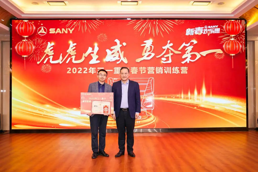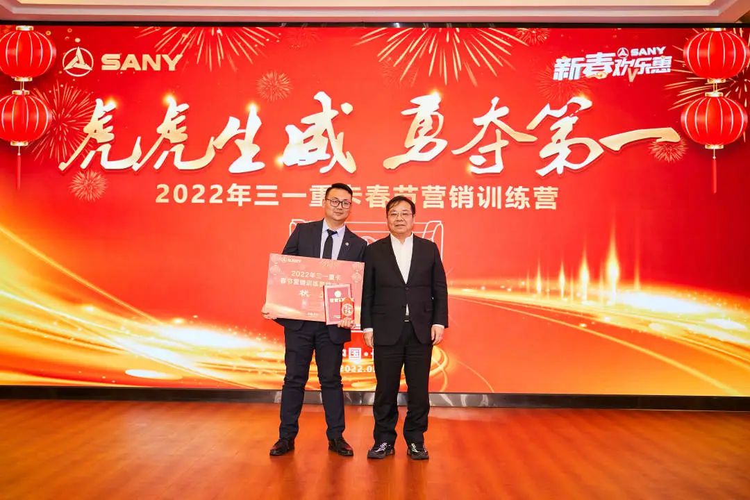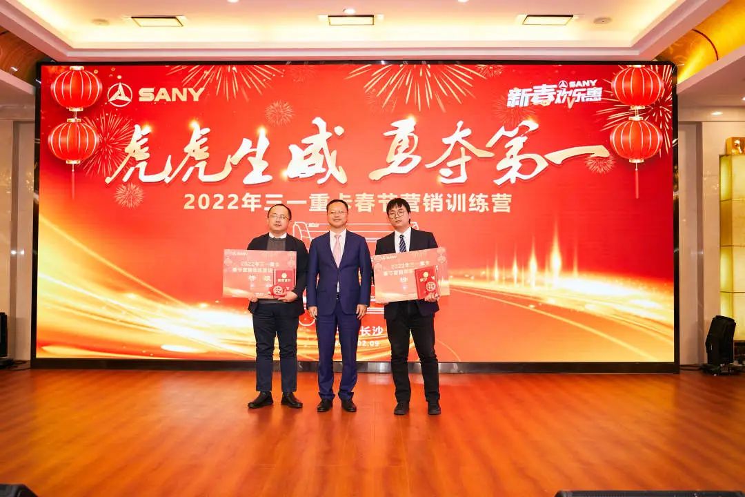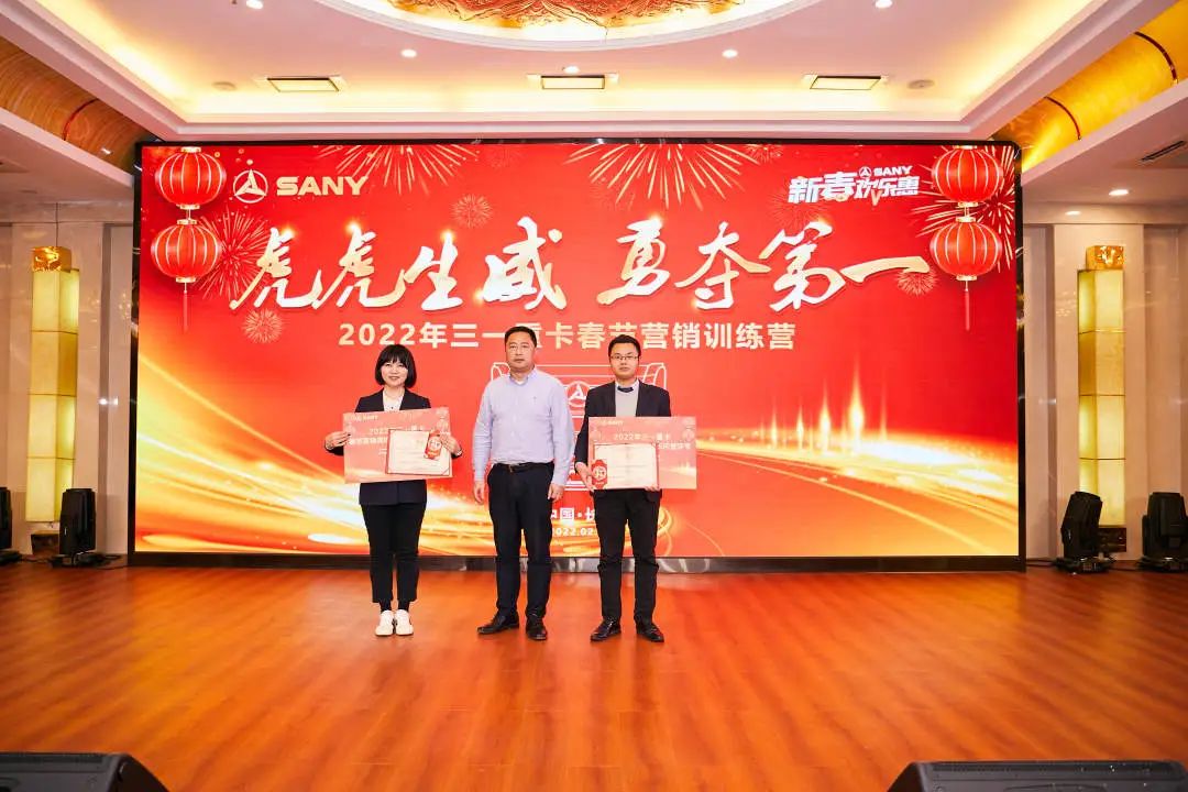 在表彰环节,三一集团副总裁、三一重卡董事周万春,营销公司总经理刘竹林,电动化营销公司总经理科桦分别为春节营销训练营获得优异成绩的学员颁发证书和奖金。