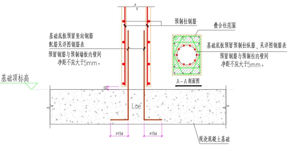 倒插式连接方案中,预制空腔柱两端出筋,基础底板浇筑混凝土前,将预制柱下部钢筋插入基础梁或承台内,与基础底板整体浇筑到一起。该连接方案整体受力好,结构受力计算及适用范围与传统现浇钢筋混凝土柱保持一致,广泛适用于各类地下室结构,并已在娄底三一街区二期等项目成功应用。