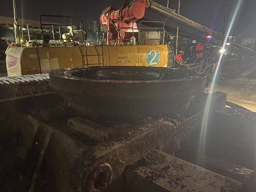 说干就干,老板要求现场连夜开始准备工作进行更换回转轴承。服务工程师立即联系配件及售后协助人员刘伟。老板马上召来吊车,风炮及人员进行协助拆卸上车体。工作强度很大。但是我们的使命就是克服一切困难为客户创造价值,解决客户的一切问题。经过指挥使设备上车部分和下车部分成功脱离并平稳的放在地面上,此时已是半夜,夜晚的寒风也抵挡不住工程师责任意志。