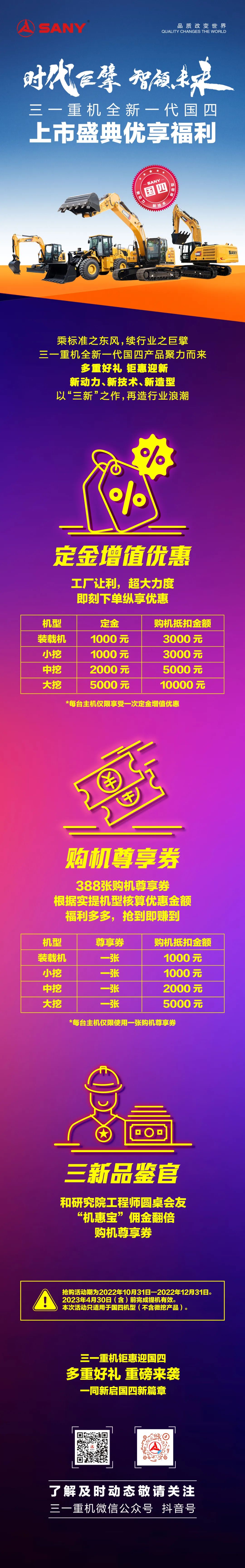 10月31日,三一重机在昆山正式发布近40款新一代国四标准挖掘机,实现全系列挖掘机的国四升级换代,向世界展示创新引领的实力。