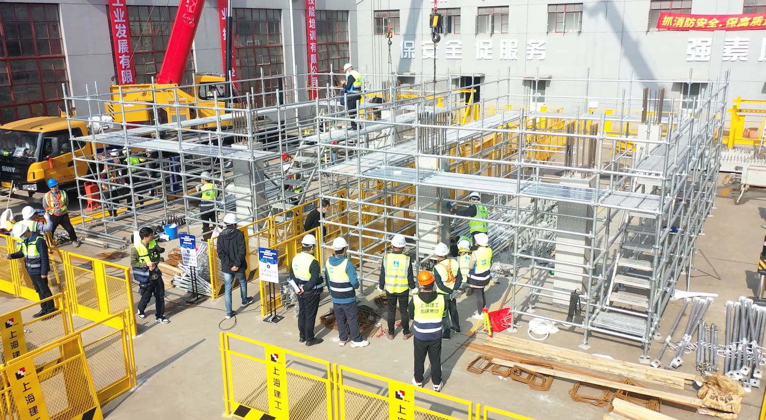 参加此项比赛的共9支队伍,每支队伍7人,其中3名辅助工,他们需要在4个小时内成功搭设一栋整体装配式框架结构的工法楼。选手们从构件吊装准备、引导就位到安装校正,有条不紊地操作着。一旁的3台三一起重机高举大臂,与他们紧密配合。