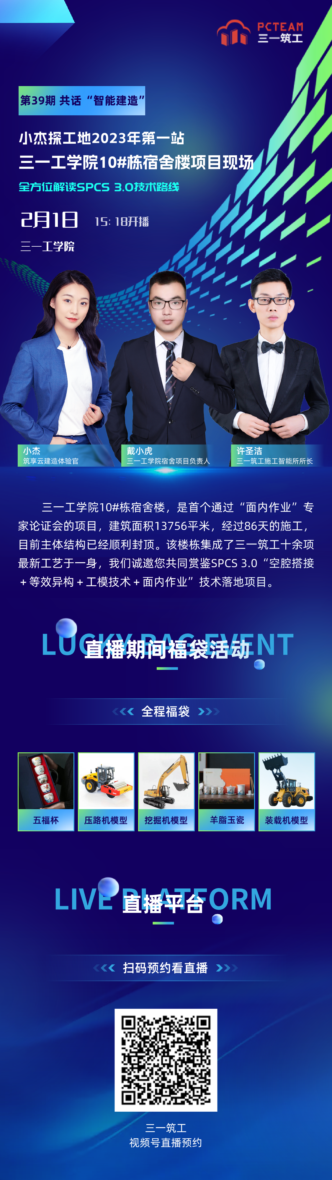 2月1日15:18,癸卯兔年,三一筑工新春首播将由筑享云建造体验官小杰带领大家探访工地,第一站来到三一工学院10#栋宿舍楼项目现场,特邀三一工学院宿舍项目负责人戴小虎、三一筑工施工智能所所长许圣洁全方位解读SPCS 3.0技术路线。