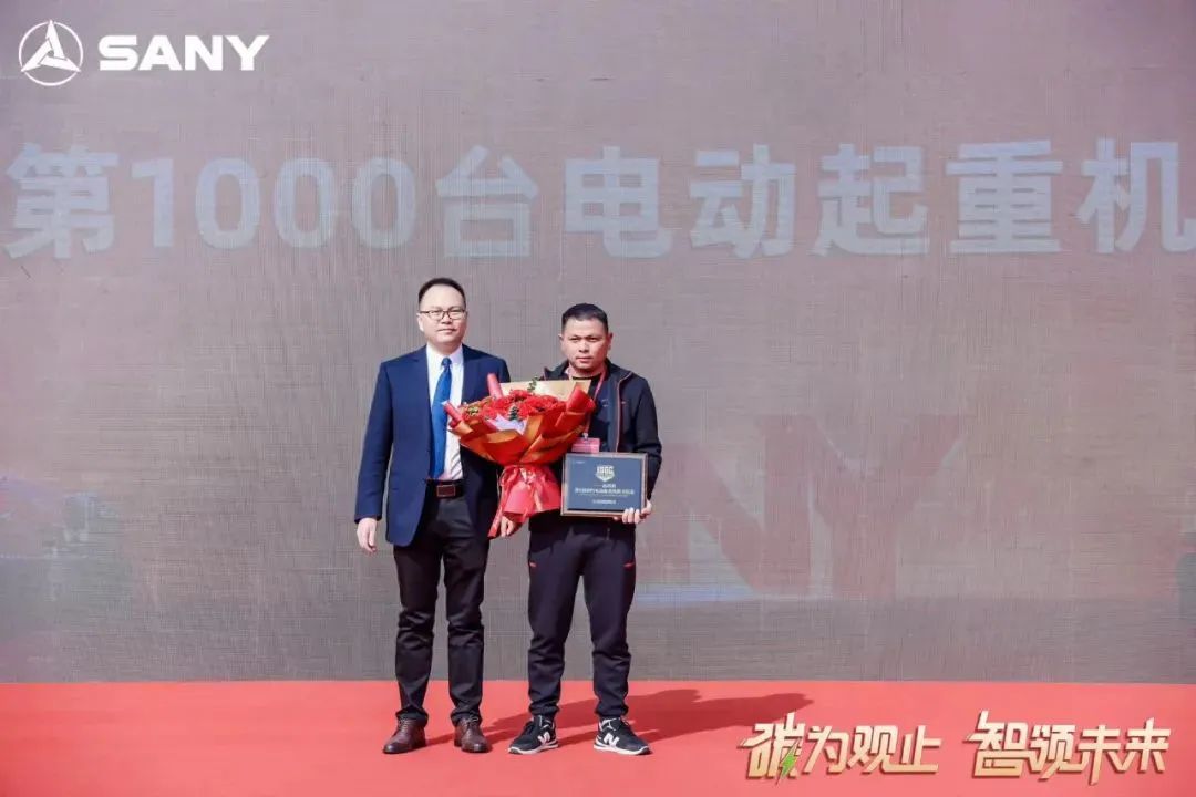 新能源产品作为未来发展“突围破局”的密钥,被摆在了至关重要的位置。作为起重机行业的新能源标杆,去年三一成绩斐然,销售已破千台。活动现场,三一重起营销公司总经理饶文武为第1000台新能源起重机机主藤县藤发吊装有限公司授牌。