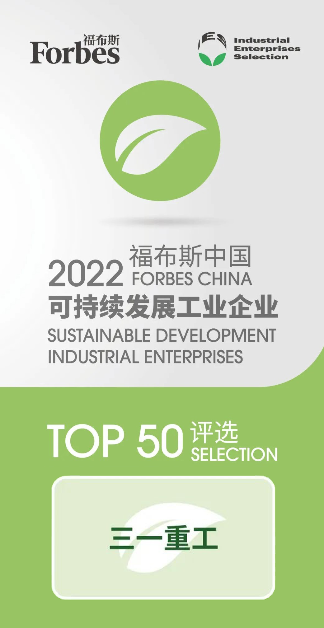 近日,福布斯中国发布“2022可持续发展工业企业TOP50”,三一重工榜上有名,被评为年度可持续发展工业企业的行业标杆。