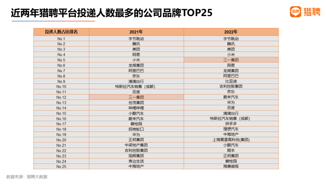 近日,中高端招聘平台猎聘发布《2022年度就业趋势数据报告》,报告显示,在2022年求职者投递公司TOP25榜单中,三一集团位列第5,较上一年度跃升7个名次,成为年度最大黑马。