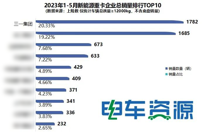 1-5月,三一累计销售1782辆新能源重卡,占比20.33%,同比增长71.35%,夺得销量“双冠”!