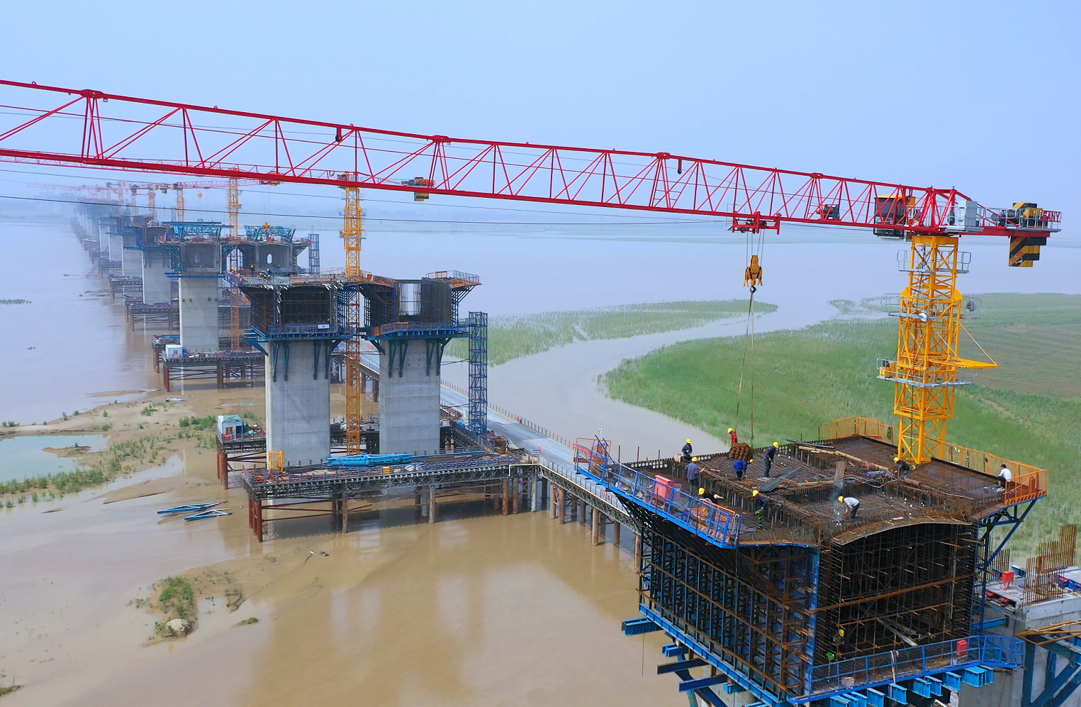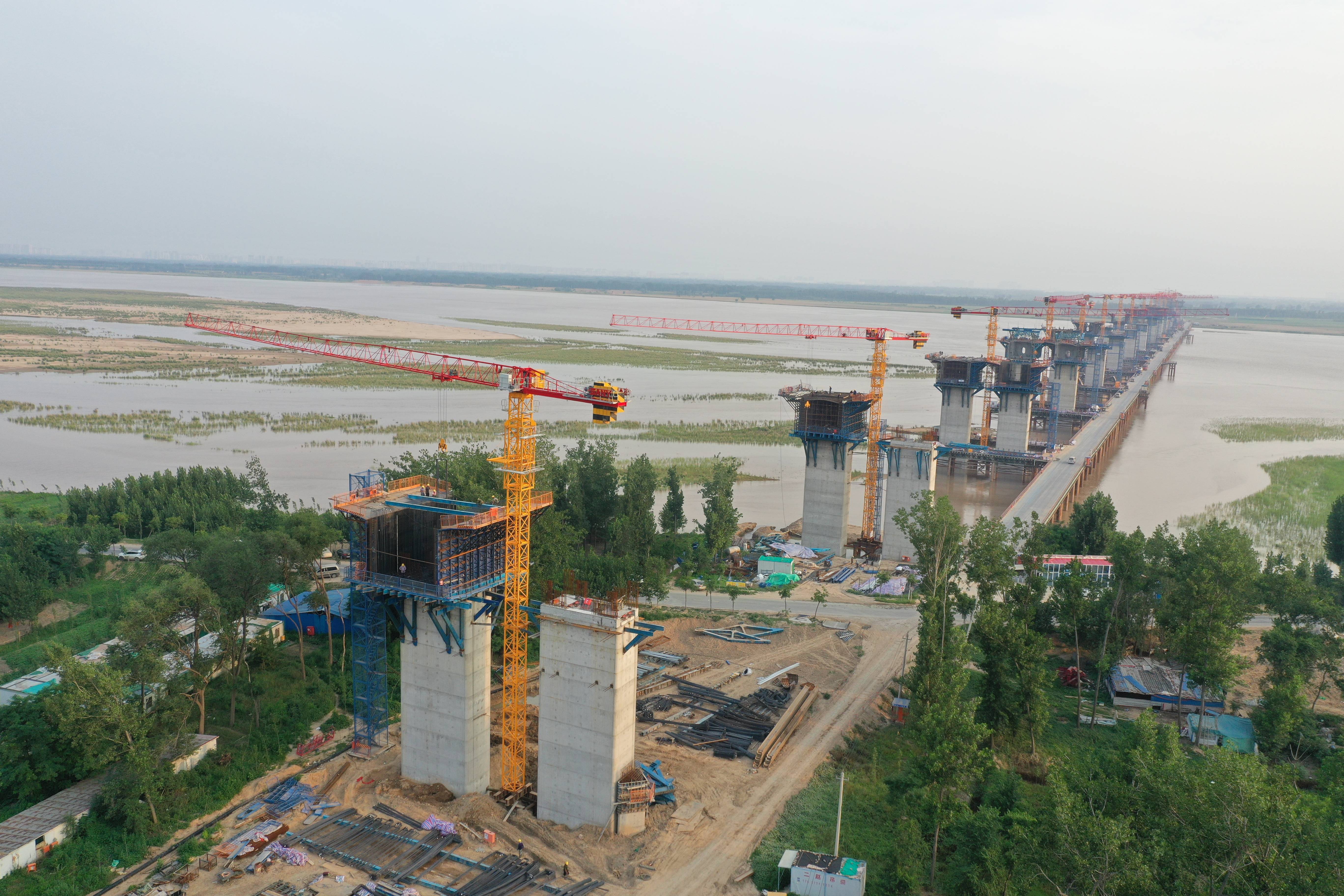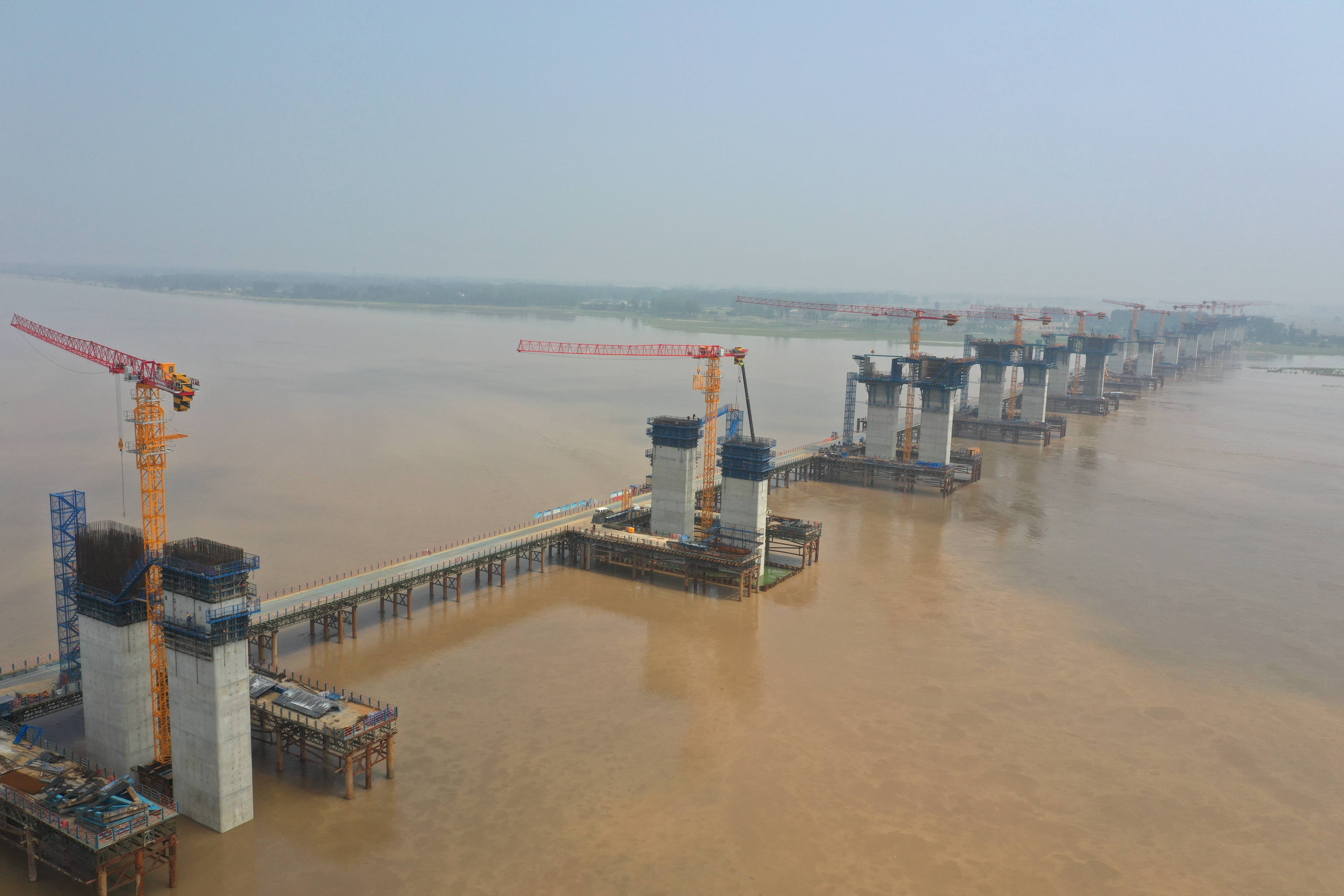 施工现场,上千名施工人员坚守岗位,挥汗如雨,用辛勤的劳动努力推进项目建设。于金龙介绍:“自今年3月份以来,跨河主桥桥墩出水之后,项目陆续进场了14台三一SFT125(T6016-8C5)平头塔机,这些设备在堤内引桥桩基施工、跨大堤桥钢箱梁吊装、主桥薄壁墩等施工中发挥着明显的作用。”