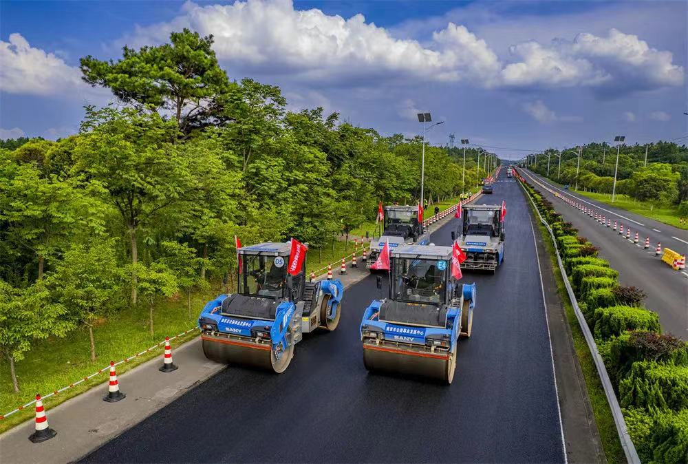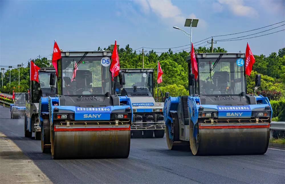 骄阳红似火,施工正当时。三一“黑科技”无人摊压机群出征南京,助力南京市普通国省道养护大中修工程S246宁郎线溧水段。