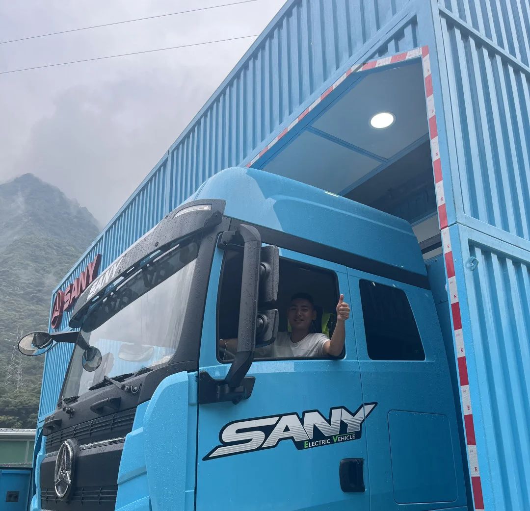 今年7月,积极推进车队绿色运输转型,首批购入10台350度电量的三一电动重卡江山EV550,充换电一体,全力服务建筑材料运输。