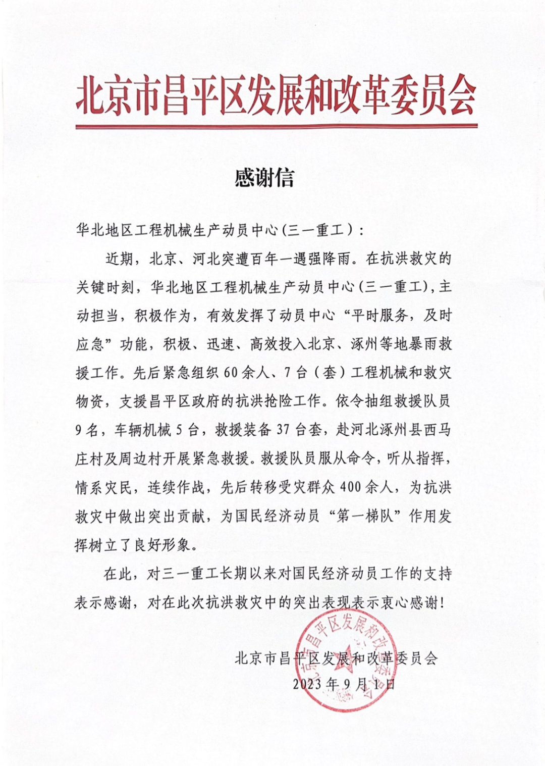 近日,三一重工收到了一封来自北京市昌平区发展和改革委员会发来的感谢信。