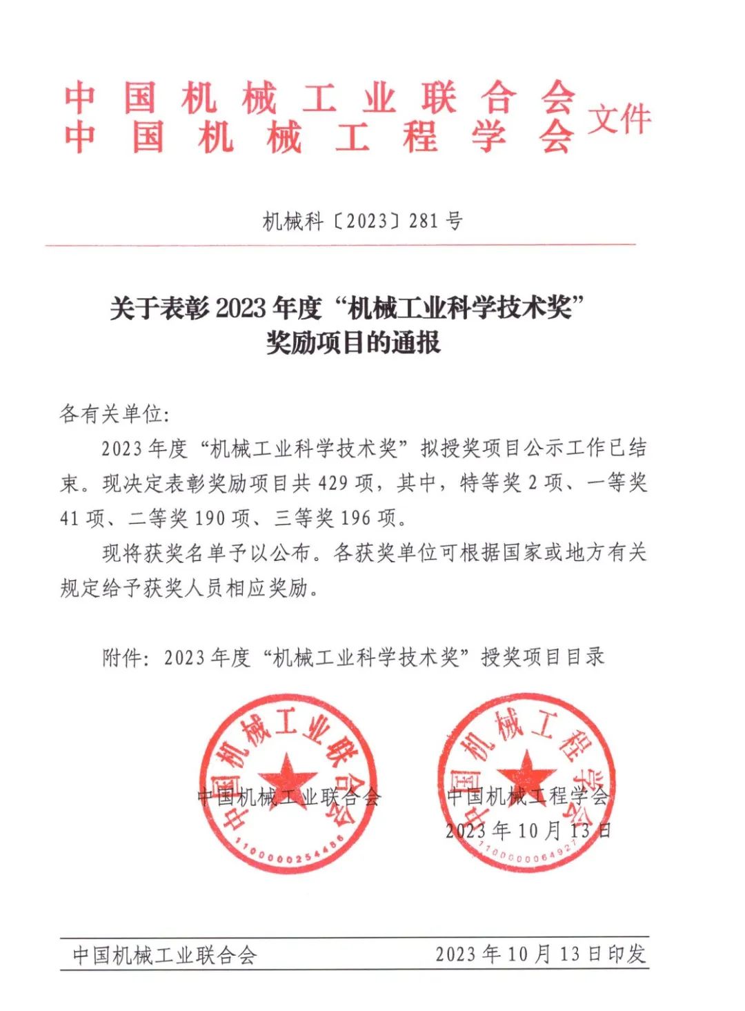 十、2023年度“机械工业科学技术奖”