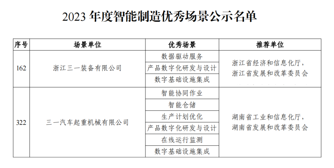 这一年,三一重起事业部浙江三一装备有限公司与三一汽车起重机械有限公司共9个场景再获国家级认可,入选工业与信息化部2023年度智能制造优秀场景名单。
