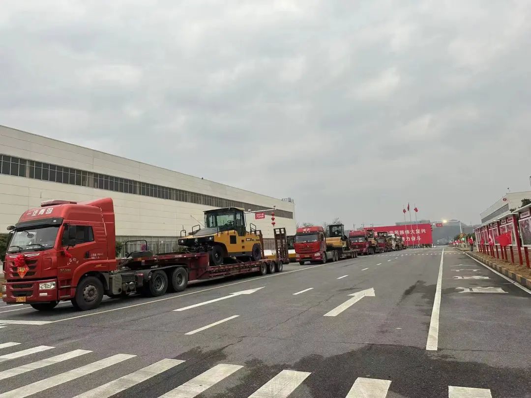 在涟源产业园,准备交付的三一压路机装满了长长的一列平板车队