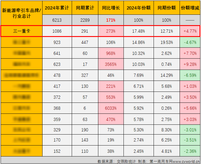 从全年来看,2024年1-3月新能源牵引车市场同比大增171%,其中,三一同比大增273%,跑赢大盘。