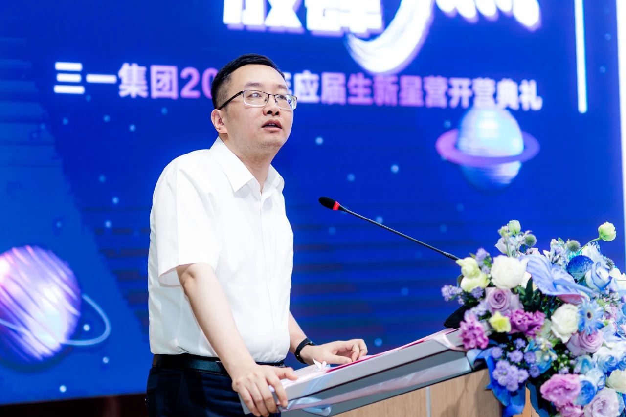 唐修国代表三一集团全球员工对2024届新星的到来表示欢迎,并从三一的使命、愿景、价值观出发,与新星们畅谈三一创业故事、行业发展趋势与公司“三化”转型。