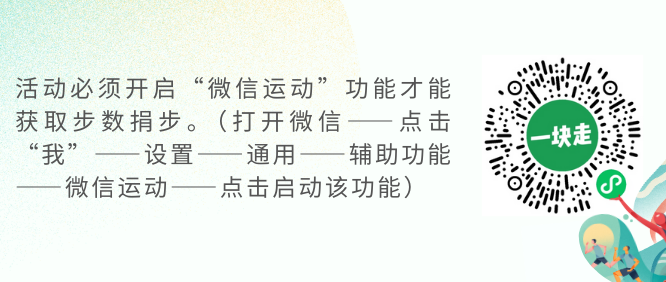 微信扫描下方小程序码进入“一块走”小程序,点击活动首页下方“加入活动并捐步”,并开启“微信运动”步数的权限。