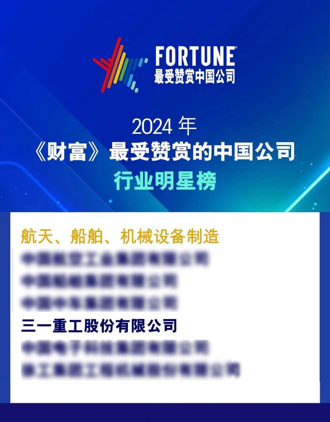 据悉,参与榜单申报而进入候选池的332家公司既有《财富》世界500强和中国500强,也有“镁光灯下”的明星公司。最终,行业综合得分领先的公司进入行业明星榜,综合得分最高的50家公司荣登“《财富》最受赞赏的中国公司”全明星榜。其中,三一是唯一进入全明星榜的工程机械企业。