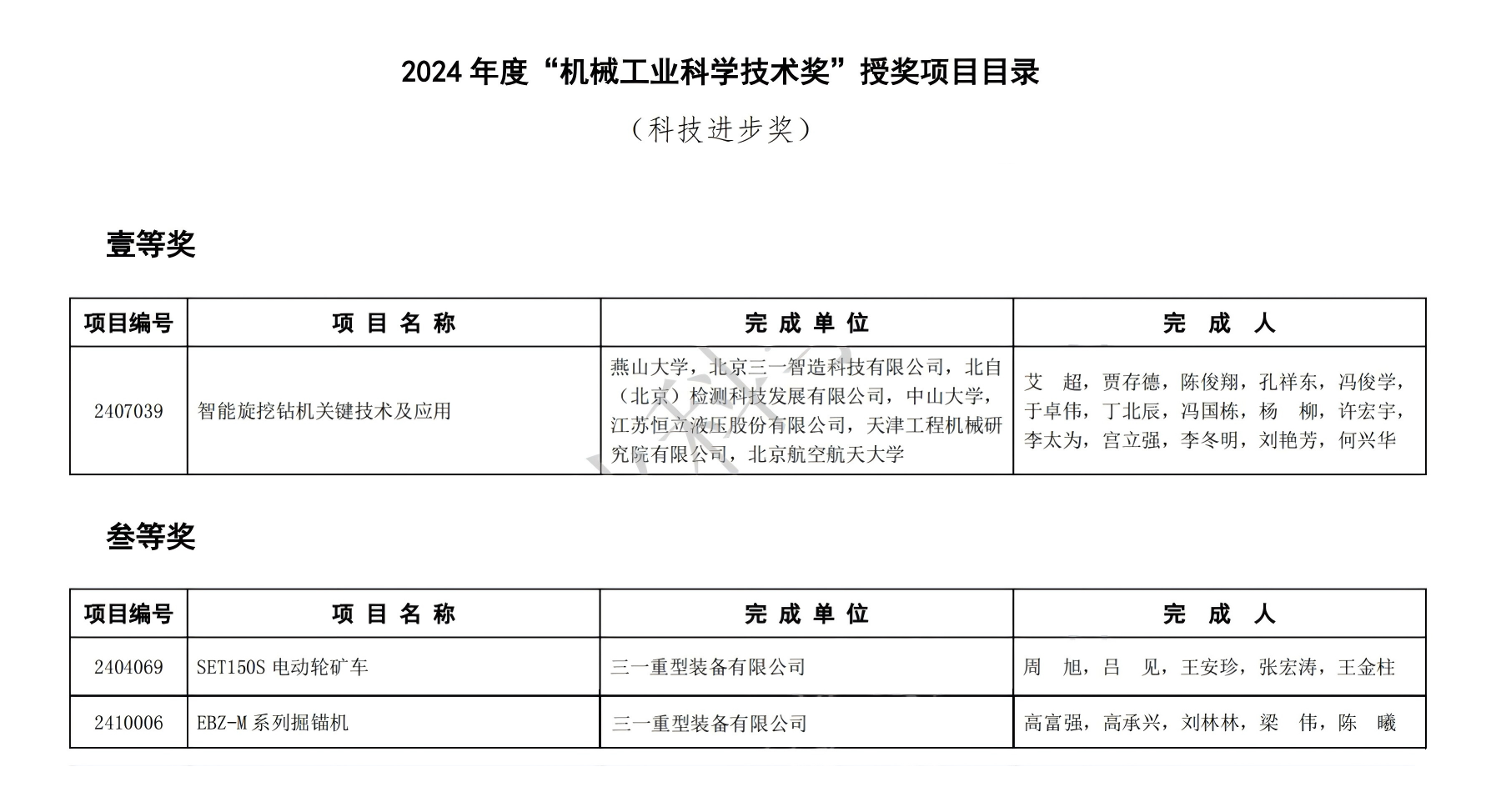 北京三一智造科技有限公司“智能旋挖钻机关键技术及应用”项目荣获科技进步奖一等奖;三一重型装备有限公司“SET150S电动轮矿车”项目、“EBZ-M系列掘锚机”项目荣获科技进步奖三等奖。