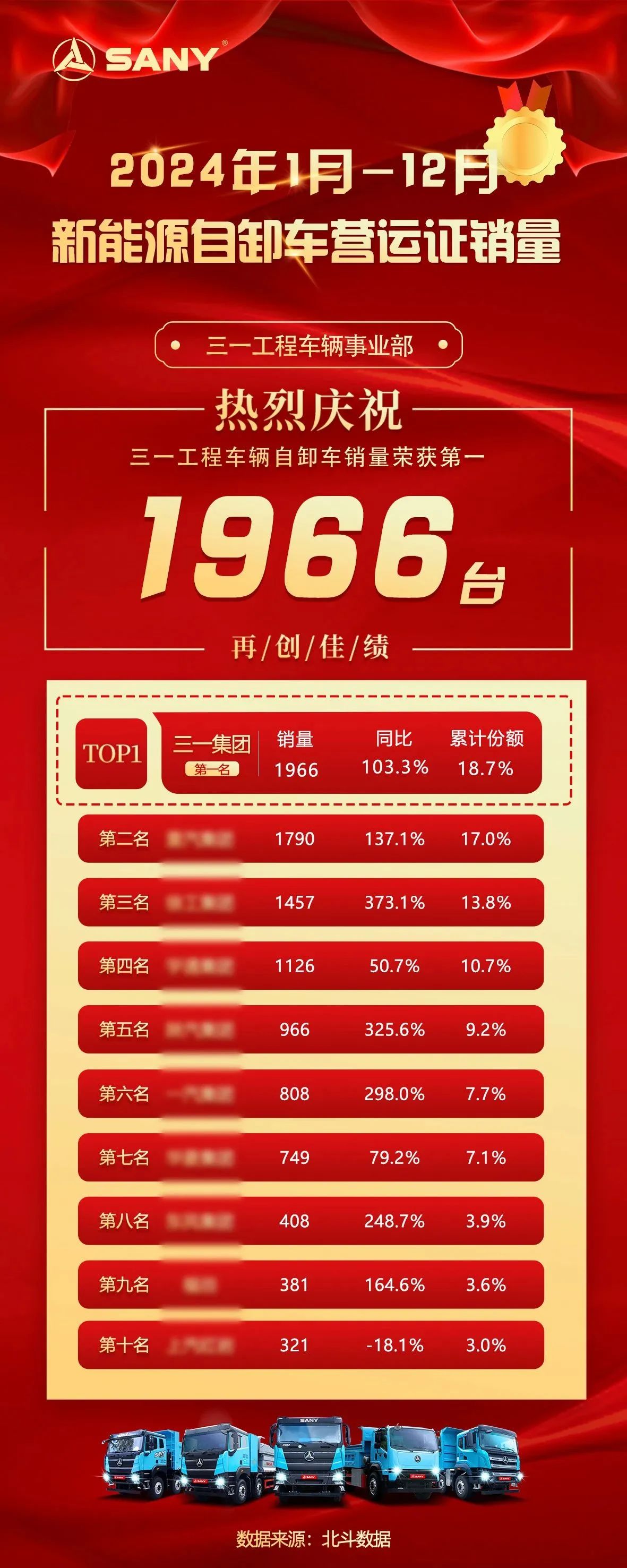 根据北斗数据,2024年1月-12月新能源自卸车营运证销量显示,三一工程车辆新能源自卸车实销1966台,同比增长103.3%,累计份额18.7%,在年度销量争夺战中赢得销冠,领跑市场!