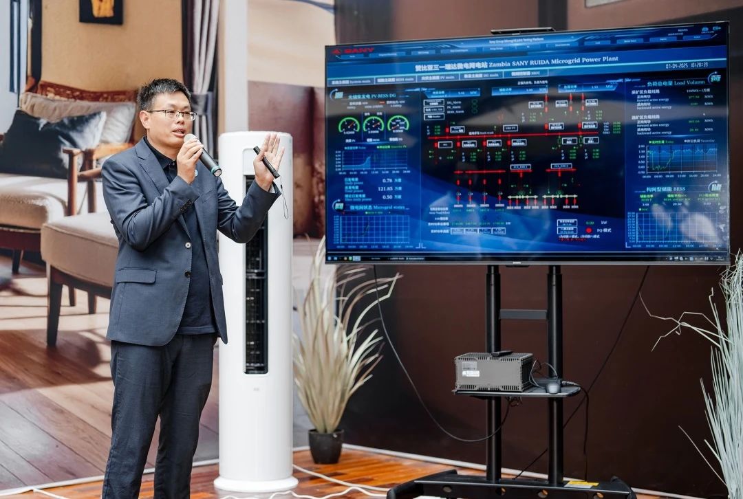 通过一张数智大屏,三一硅能微电网研究院副院长邓俊波向使节团介绍了赞比亚瑞达微电网电站的运营情况。该项目是非洲单体规模最大的光储柴矿山微电网项目,配置了20MWp的光伏系统以及总容量达60MWh的储能电池系统,并配备柴发系统作为备用电源,构建一套集光伏、储能和柴发于一体的先进微电网综合能源系统,为矿区供应稳定可靠电力保障。