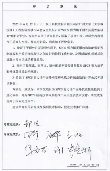 通过对研究内容的质询与交流,专家组经充分讨论后一致认为:本研究项目为SPCS剪力墙平面外抗震性能提供了量化依据,并为SPCS结构技术体系的推广应用提供技术支撑,研究成果达到了国际先进水平。建议可结合相关研究成果编制技术标准, 促进技术推广应用。