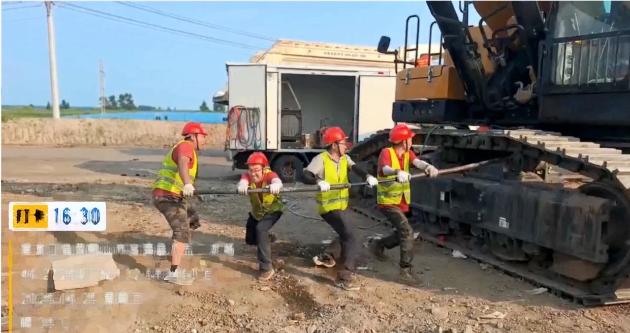 此时的宝清地区正遭遇高温天气,室外温度高达36度,矿区地表温度更是突破40度。服务人员们顶着烈日炙烤,钻进闷热的设备底盘下作业,汗水浸透了工装,手上沾满了油污,却没有人叫苦叫累。张杰海凭借丰富经验指导孔位修复;马延军细致耐心,专注螺丝孔打磨把控每个螺丝的校准调试;李璐和鞠成波年轻力壮,主动承担部件搬运等重活……四人分工协作,配合默契,每天从清晨忙碌到深夜,全力推进安装进度。