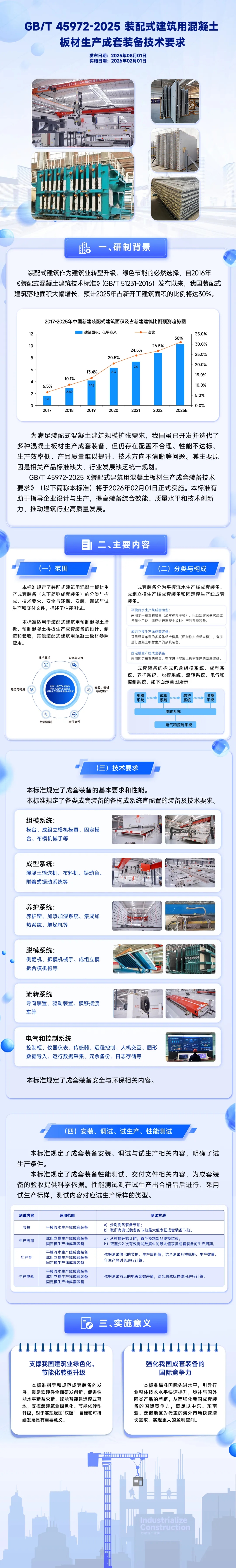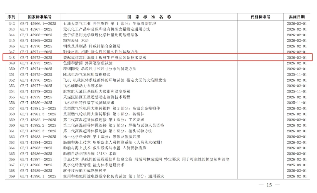 近日,国家市场监督管理总局(国家标准化管理委员会)批准416项推荐性国家标准和3项推荐性国家标准修改单(2025年第19号),其中包括全国建材装备标准化技术委员会(SAC/TC465)归口管理、由三一筑工作为第一单位编制的GB/T 45972-2025 《装配式建筑用混凝土板材生产成套装备技术要求》国家标准,自2026年2月1日起实施。
