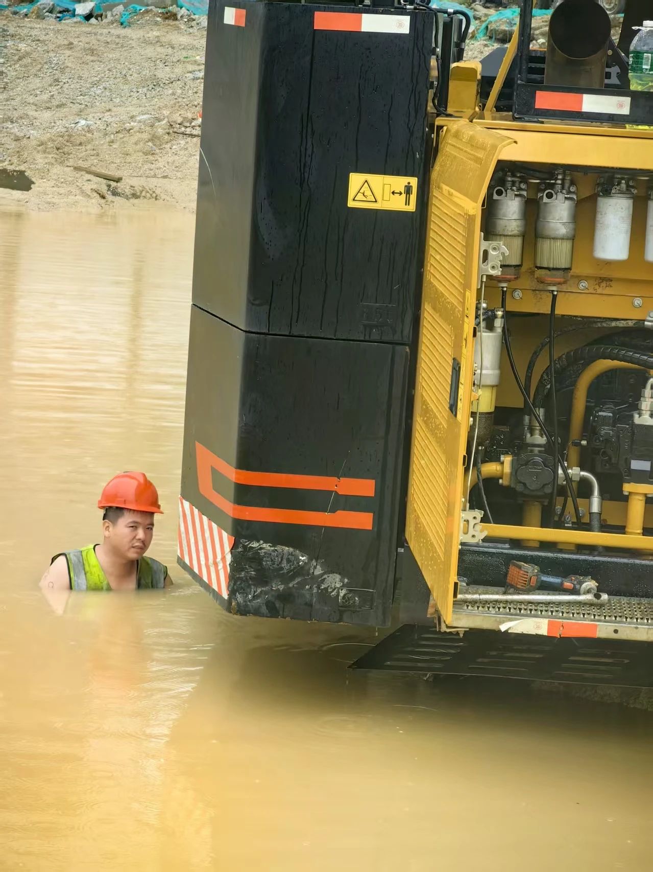 了解情况后,服务工程师刘伟和梁二虎立刻驱车出发,在积水严重的道路上艰难跋涉50公里,终于抵达工地。眼前的景象令人揪心:基坑内水位已高达1.5米以上,设备大半浸在水中,情况危急。
