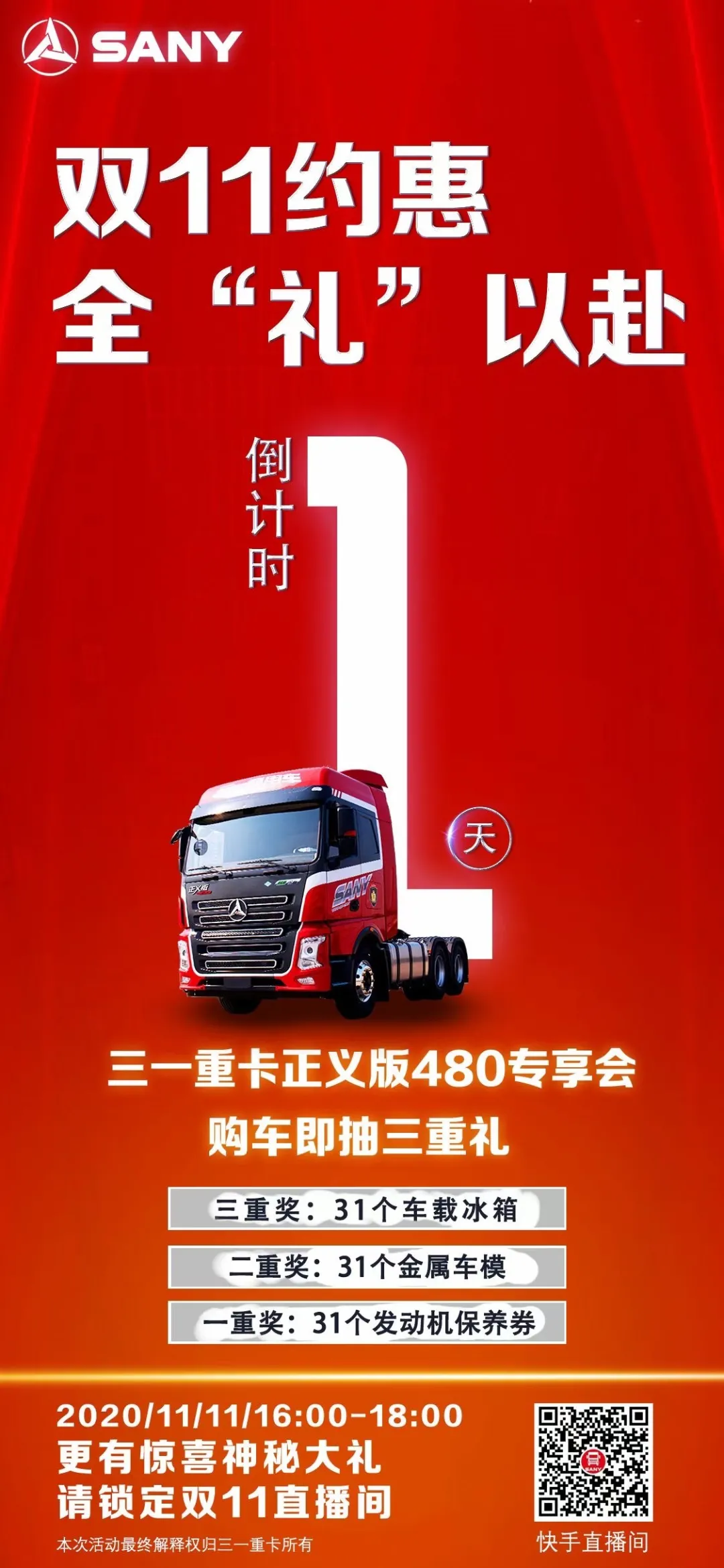 三一重卡正义版自上市后频频收到卡友的订单,每天来厂区提车的卡友络绎不绝,双11当天,三一重卡为满足客户需求,将特别打造了一场正义版480的专享会, 购车即抽三重礼!