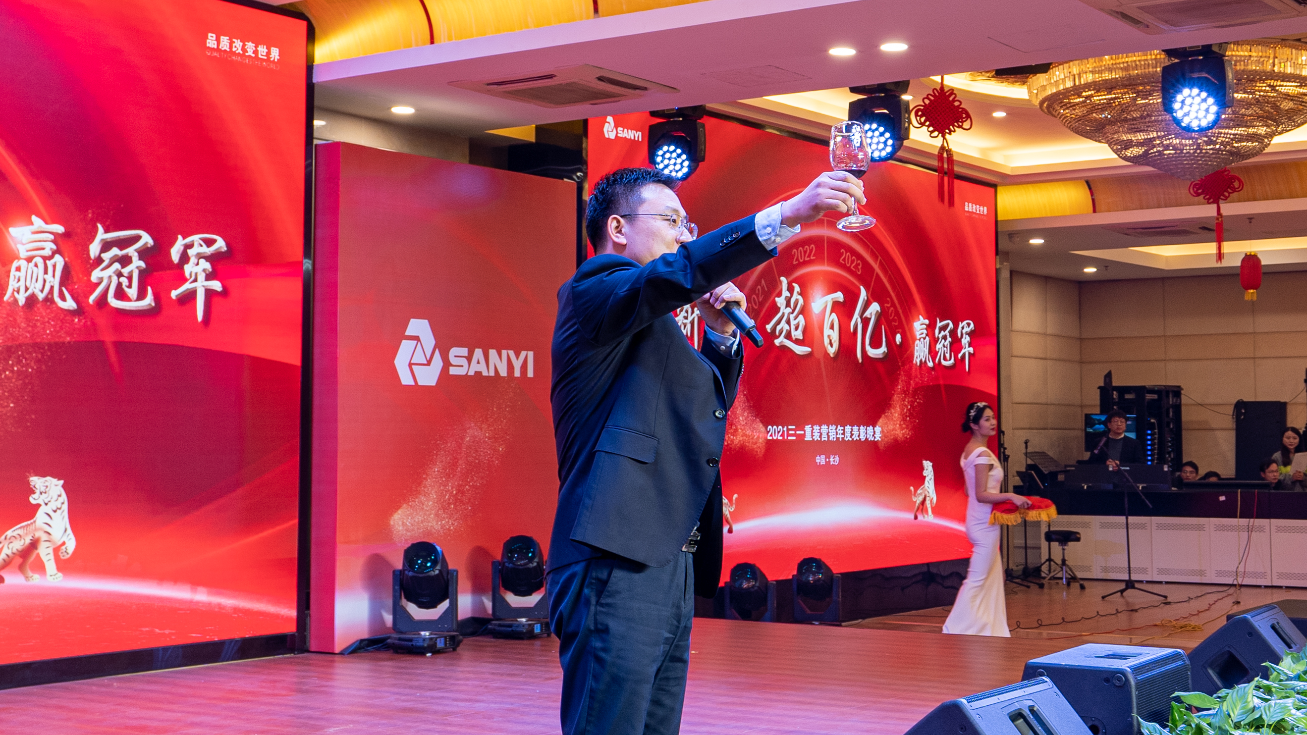 30日晚间,2021三一重装营销年度表彰晚宴盛大举行。柴文俊先生上台致祝酒辞,向参加晚宴的各位领导表示