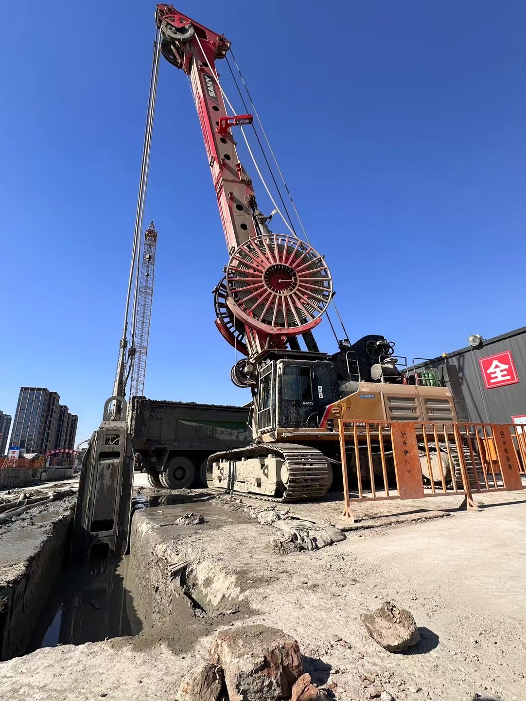 墙厚1m、宽度6.8m、深度56m,共70多幅墙。由于地层复杂、难度大、工期紧,客户选用三一抓斗SH950一抓到底。