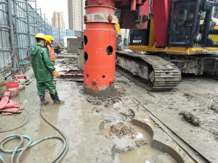施工工艺:修筑导墙、选择钻斗和套管、利用旋挖钻机动力头对套管施加扭矩及向下压力,将护筒下入淤泥中,直至护筒上端高出地面 0.5~1m,然后断开套管与驱动花筒的连接,边超前钻进边继续对接下一节套管,直至设计深度,灌注混凝土、拔出套管。