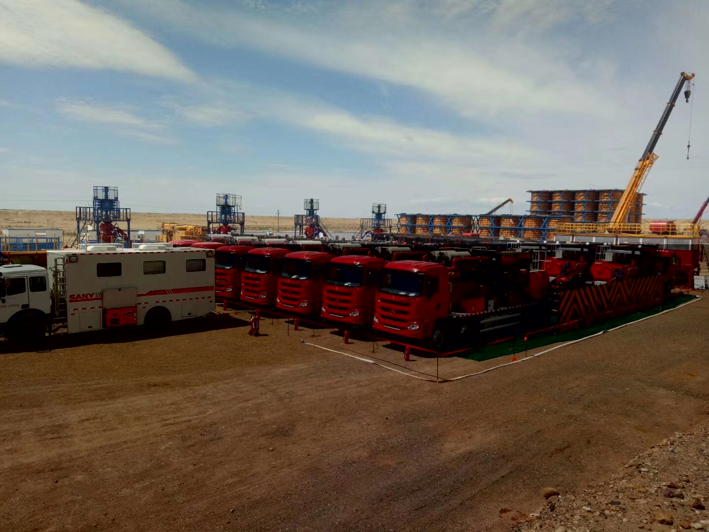 三一石油 2500 型压裂车组在低温环境及恶劣工况下未出现故障,历时 18 天,提前完成大井位水平井作业。三一石油2500 型压裂车组赴内蒙乌审旗苏里格气田进行高压大型气井压裂施工,挑战中国最大整装气田中最复杂的“万方液,千方砂”大型压裂施工项目。车组在不停机、不拔泵、不换泵耗品的情况下“停人不停车”,连续作业超过 16 个小时,设备运行稳定,高效。施工期间,砂量输出 400 方,液量 6000 方,排量 6 方,压力 25~ 55Mpa,设备完全满足现场施工技术要求。