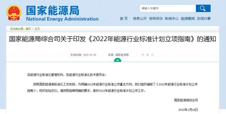 2022年1月20日,国家能源局综合司发布关于《2022年能源行业标准计划立项指南》的通知提出:新能源和可再生能源专业方向之“风能”行业标准方向包括风电节能降碳与安全管理,风电场改造升级,风电设备退役循环利用,风电机组关键零部件四大类列入能源行业标准计划立项重点方向。另外,立项指南还列出了新型储能和氢能关键技术和电力相关输配电关键技术、节能低碳技术和电力新模式等。