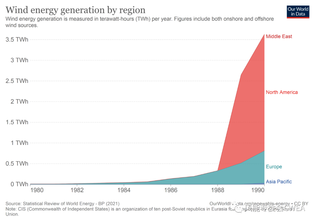 1980年至2000区间:数据显示,1980年至1990年,风能发电量全球不超过5TWh,其中以美国为主的北美风力发电量占主要,超过80%;自1990年开始,欧洲在技术和政策双重推动下快速攀升,至1995年已超越北美。亚太地区,到1995年数据还不大,直到2000年,整个亚太地区所占的份额还非常低,增长缓慢,总发电量不超过2.5TWh。