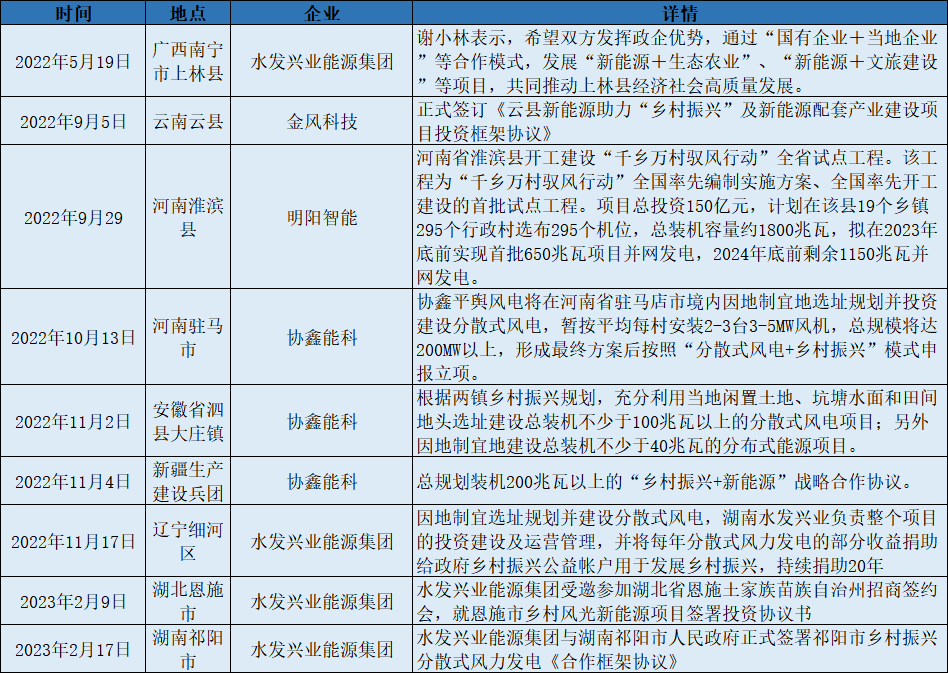 在企业方面,风芒能源根据公开信息不完全统计,已有多个企业与市(县、生产建设兵团)签约“新能源+乡村振兴”项目。