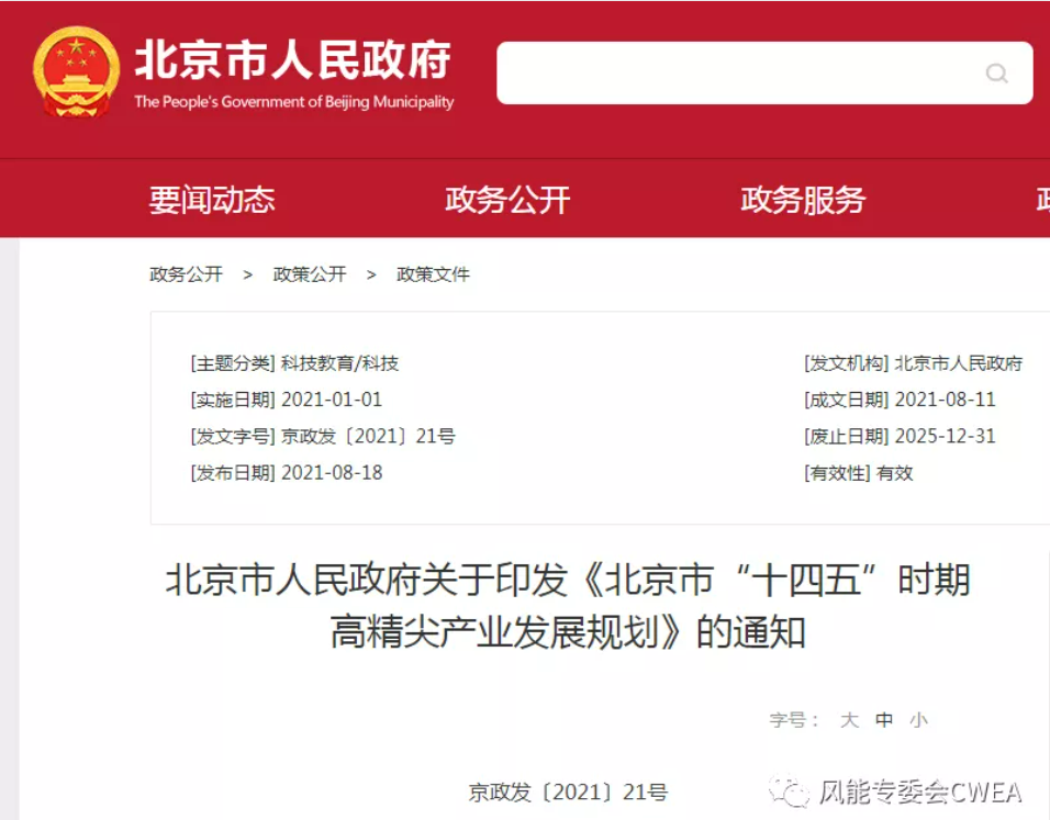 8月18日,北京市人民政府印发《北京市“十四五”时期高精尖产业发展规划》,规划提出:发展大功率风力发电机组及关键部件、发电机高性能控制技术和基于大数据的风电场群智能运维装备。