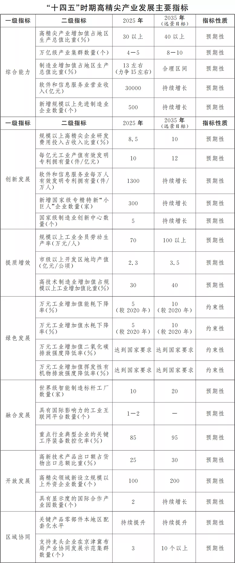 “十四五”时期是我国开启全面建设社会主义现代化国家新征程、向第二个百年奋斗目标进军的第一个五年,也是北京落实首都城市战略定位、建设国际科技创新中心、构建高精尖经济结构、推动京津冀产业协同发展的关键时期。在全球创新版图重构以及我国加快构建双循环新发展格局的时代背景下,北京高精尖产业要坚持以首都发展为统领,巩固产业调整转型的良好势头,准确把握新发展阶段,深入贯彻新发展理念,主动融入新发展格局,全力推进高质量发展,切实肩负起国家赋予的使命和责任。 本规划根据《中共北京市委关于制定北京市国民经济和社会发展第十四个五年规划和二〇三五年远景目标的建议》《北京市国民经济和社会发展第十四个五年规划和二〇三五年远景目标纲要》制定,提出的高精尖产业主要涉及先进制造业、软件和信息服务业、科技服务业,是对“十三五”时期十大高精尖产业内涵的拓展和提升,实施期限为2021年至2025年,远景展望到2035年。 党的十八大尤其是2014年习近平总书记视察北京并发表重要讲话以来,全市统筹疏解非首都功能、构建高精尖经济结构、推动京津冀产业协同发展,高精尖产业进入创新发展、提质增效新阶段,为“十四五”时期构建现代产业体系奠定了坚实基础。 产业发展能级实现新跃升。2020年全市高精尖产业实现增加值9885.8亿元,占地区生产总值比重达到27.4%,较2018年提高2.3个百分点;培育形成新一代信息技术(含软件和信息服务业)、科技服务业两个万亿级产业集群以及智能装备、医药健康、节能环保、人工智能四个千亿级产业集群。 产业创新能力明显提高。2020年高精尖产业研发经费投入占收入比重7.3%。创建3个国家级制造业创新中心、92个企业技术中心和8个工业设计中心,布局人工智能、量子、脑科学等一批新型研发机构。拥有独角兽企业93家,数量居世界城市首位。涌现出柔性显示屏、国内首款通用CPU(中央处理器)、新冠灭活疫苗、5G+8K(第五代移动通信技术+8K超高清分辨率)超高清制作传输设备、新型靶向抗癌新药、手术机器人、高精密减速器等具有全球影响力的创新成果。 产业项目落地取得丰硕成果。落地投产新能源整车产线,建成全球首个网联云控式高级别自动驾驶示范区。建设国内规模最大的12英寸集成电路生产线、8英寸集成电路国产装备应用示范线。国家级专精特新“小巨人”、制造业单项冠军、智能制造示范项目和系统解决方案供应商数量全国领先,涌现出福田康明斯“灯塔工厂”、小米“黑灯工厂”等行业标杆。率先启动建设国家网络安全产业园,聚集全国半数以上网络安全和信创企业。落地工业互联网标识解析国家顶级节点、国家工业互联网大数据中心和安全态势感知平台等一批重大基础设施平台。 产业提质增效迈出坚实步伐。2016年至2020年全市累计退出一般制造业企业2154家。2020年规模以上工业人均产值、规模以上制造业地均产值较2015年分别增长59%、19.2%;规模以上软件和信息服务业人均营业收入较2015年增长99.1%。 京津冀产业协同开创全新局面。京津冀三地协同推进规划共编、项目共享、企业互动、园区共建,“2+4+N”产业合作格局初步形成;城市副中心产业“腾笼换鸟”全面推进,积极对接雄安新区规划建设;汽车、医药、装备、大数据和云计算等领域的产业合作和项目落地取得重大突破。 “十四五”乃至更长时期,北京高精尖产业仍将处于大有可为的战略机遇期。从全球看,世界正经历百年未有之大变局,国际环境日趋复杂,经济和科技竞争更趋白热化,信息、生物、新材料、新能源等领域的技术突破与交叉融合,将对产业转型升级和变换发展赛道产生深刻影响;从国内看,我国经济已进入高质量发展新阶段,着力构建新发展格局,加快发展现代产业体系,将为北京高精尖产业创新发展注入新活力。经过前期的创新积累和产业孵育,北京高精尖产业发展进入了创新自主化的攻坚期、产业集群化的发力期和数字智能化的迸发期。 同时,北京高精尖产业综合实力与首都高质量发展的要求仍然存在差距:先进制造业核心竞争力不强,对本市国际科技创新中心和现代产业体系建设支撑不够;从科技研发到落地转化的创新闭环尚未完全打通,高精尖产业持续发展动能不足;产业数据赋能与智慧提升的潜能尚待挖掘,新产业新业态倍增发展势能释放不够;产业链、供应链“卡脖子”问题依然存在,产业链活力和韧性有待提升。 坚持世界眼光、高点定位,北京必须保持发展高精尖产业的战略定力,深入落实京津冀协同发展战略,坚定不移疏解非首都功能,加快科技创新构建高精尖经济结构,探索实践具有首都特色的产业转型升级之路,塑造参与全球产业合作和竞争新优势。 以习近平新时代中国特色社会主义思想为指导,全面贯彻党的十九大和十九届二中、三中、四中、五中全会精神,深入贯彻习近平总书记对北京重要讲话精神,以首都发展为统领,以推动高质量发展为主题,以北京城市总体规划为遵循,以改革创新为动力,以加快数字产业化、产业数字化为主线,推动产业“换核、强芯、赋智、融合”,加快产业基础再造提升、产业链条优化升级、智能绿色全面覆盖、制造服务深度融合、区域发展开放联动“五个突破”,推进动力转换、效率提升、结构优化“三大变革”,实现高精尖产业