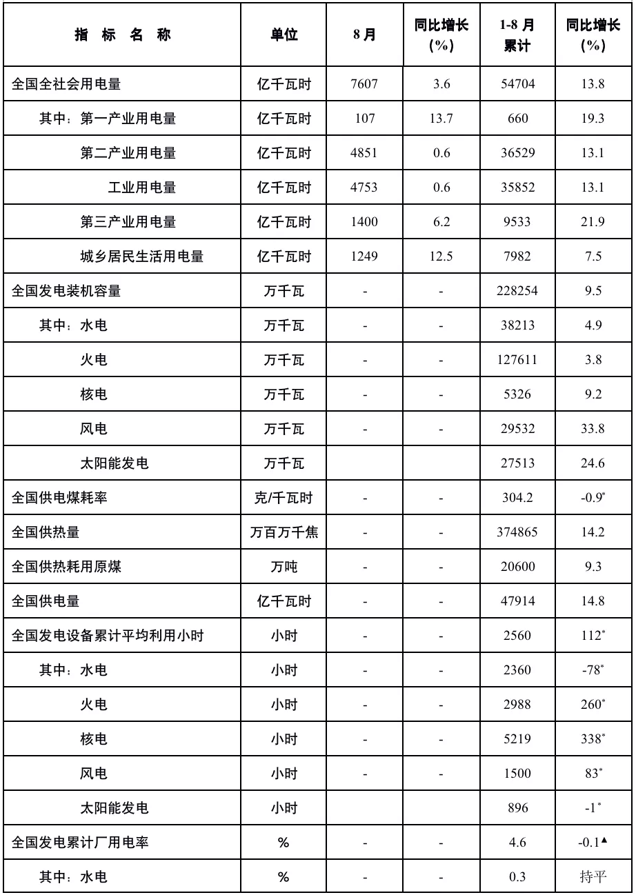 注:1.全社会用电量为全口径数据,全国供电量为调度口径数据。2.“同比增长”列中,标*的指标为绝对量;标▲的指标为百分点。