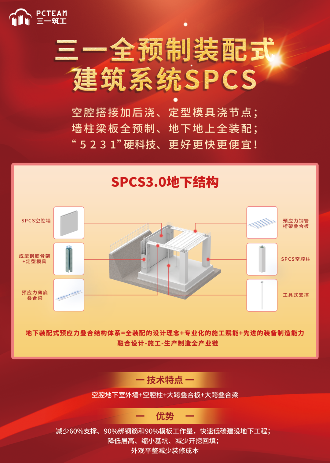 三一筑工创立于2016 年,定位为三一全预制装配式建筑解决方案(“SPCS inside”),致力于把建筑工业化,让天下没有难做的建筑。源于三一的智能制造经验和工业互联网基础,为客户提供智能装备和数字工厂、关键技术和相关标准、工业软件和共享平台,用“5231硬科技”(5 类装备、2 类标准、3 类软件、1 个平台)为行业提供“更好更快更便宜”的系统方案,推动智能建造与建筑工业化协同发展。研发的核心技术——SPCS结构技术,采用“空腔搭接加后浇,定型模具浇节点”的方式,解决行业痛点,在预制结构和地下工程防水等领域补齐装配式混凝土建筑技术体系的拼图,实现了“墙柱梁板全预制、地下地上全装配”。