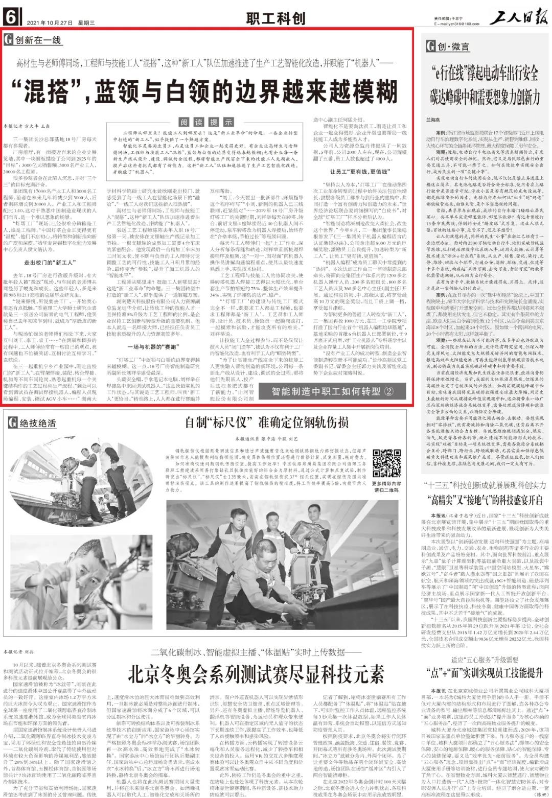 10月27日,《工人日报》刊发《智能制造中职工如何转型》系列报道之《“混搭”,蓝领与白领的边界越来越模糊》,深入走进三一集团,感受智能制造转型升级带来的变化。报道指出,在三一“灯塔工厂”中,高材生与老师傅同场、工程师与技能工人“混搭”,这种“新工人”队伍正在加速推进生产工艺智能化改造,将转型和创新推向新的广度和深度。