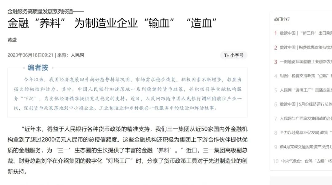 近年来,得益于人民银行各种货币政策的精准支持,三一集团从近50家国内外金融机构拿到了超过2800亿元人民币的总授信额度。这些金融机构还积极为集团上下游合作伙伴提供优质的金融服务,为三一生态圈的生长提供了丰富的金融养料。