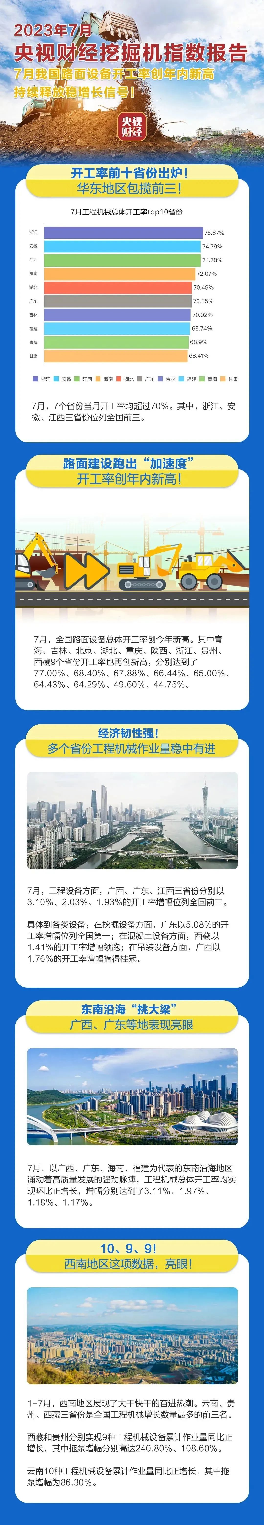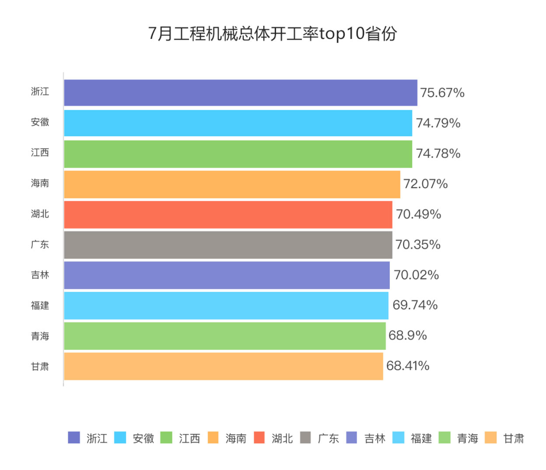 7月,工程设备方面,广西、广东、江西三省份分别以3.10%、2.03%、1.93%的开工率增幅位列全国前三。