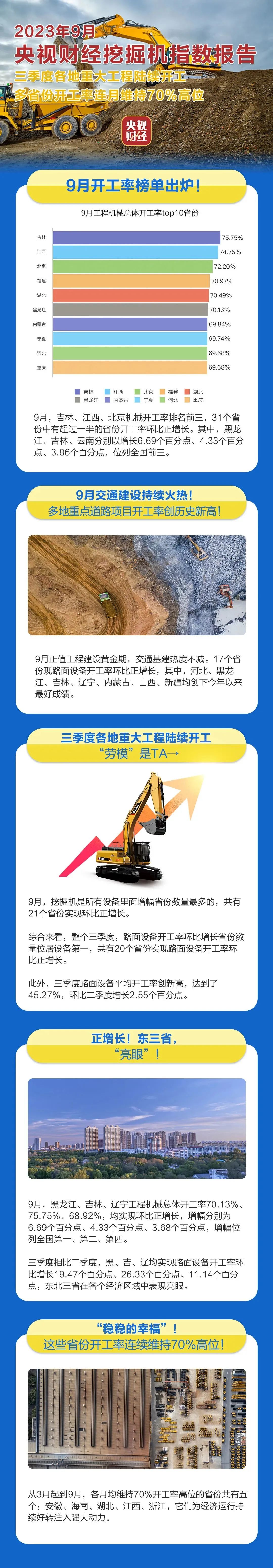 挖掘机是基础设施建设的“标配”,是反映基础设施建设、观察固定资产投资等经济变化的风向标。央视财经与三一重工、树根互联联合打造的“央视财经挖掘机指数”发布了最新相关数据。9月正值工程建设黄金期,交通基建热度不减,挖掘机也一直处于高开工状态,三季度多省份开工率连月维持70%高位。
