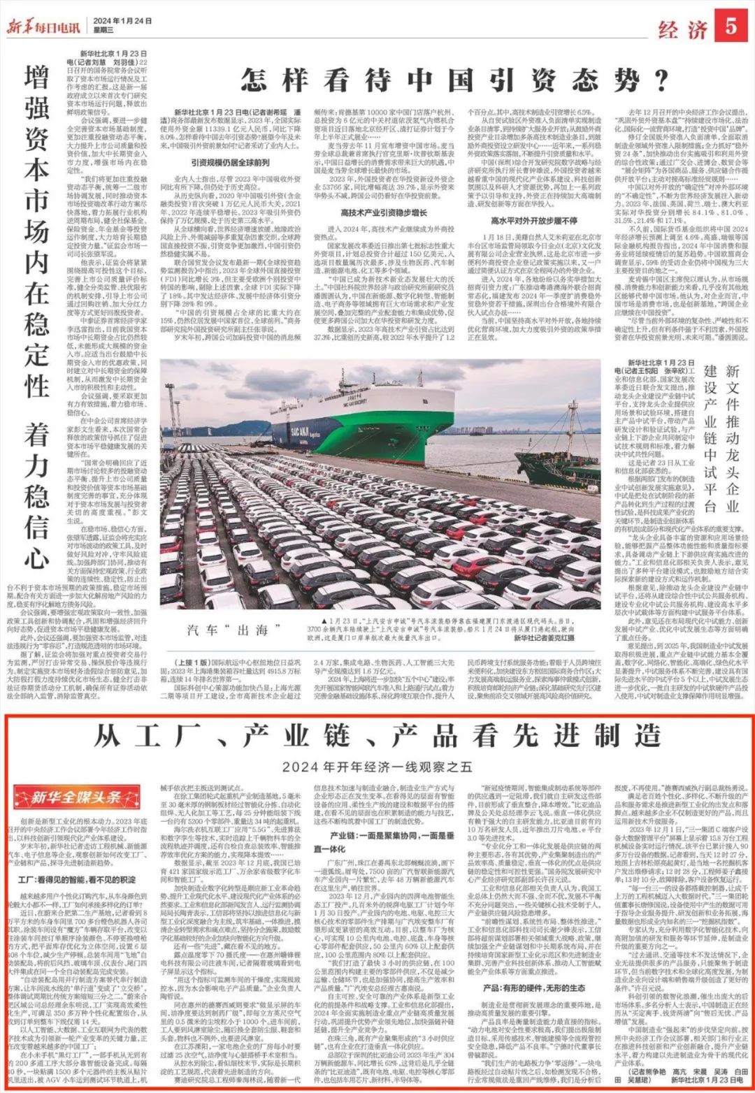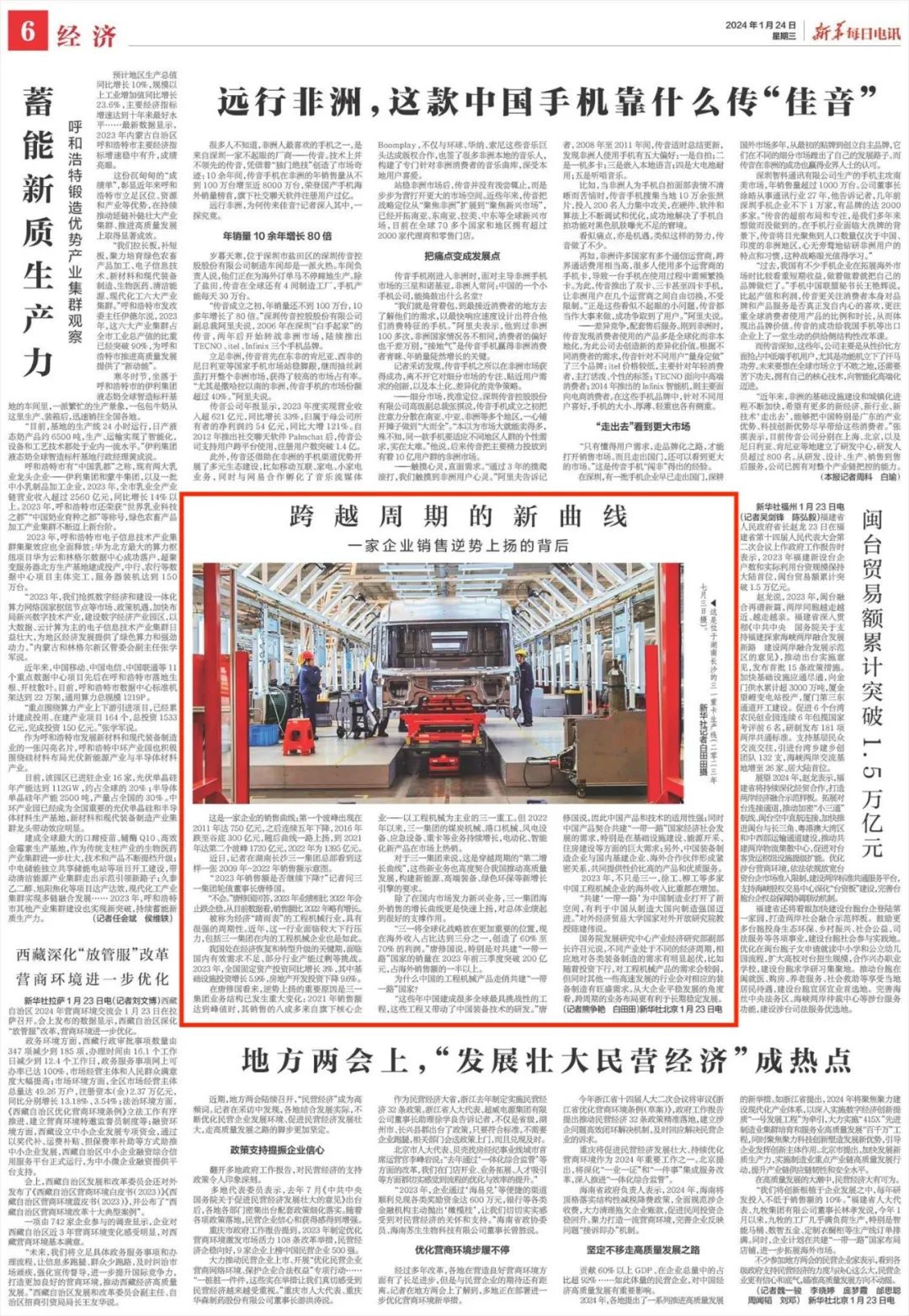 1月24日,《新华每日电讯》及新华社客户端刊发《跨越周期的新曲线——一家企业销售逆势上扬的背后》、《从工厂、产业链、产品看先进制造》两篇文章,从新兴业务发力、海外销售上扬、数智化创新等方面,多角度展现三一发展活力。