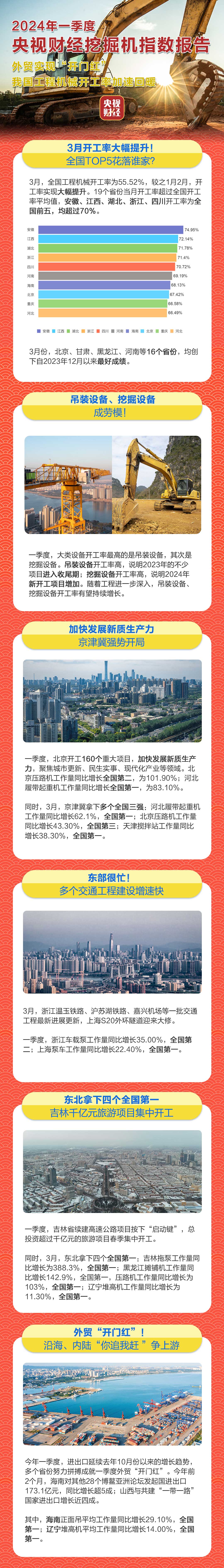 挖掘机是基础设施建设的“标配”,是反映基础设施建设、观察固定资产投资等经济变化的风向标。央视财经与三一重工、树根互联联合打造的“央视财经挖掘机指数”近日发布了最新相关数据。全国制造业PMI超预期回升,外贸“开门红”、春日经济、特别国债等成热词,展现着中国经济韧性与活力。今年一季度,我国工程机械开工率加速回暖,吊装设备、挖掘设备整体维持高位。